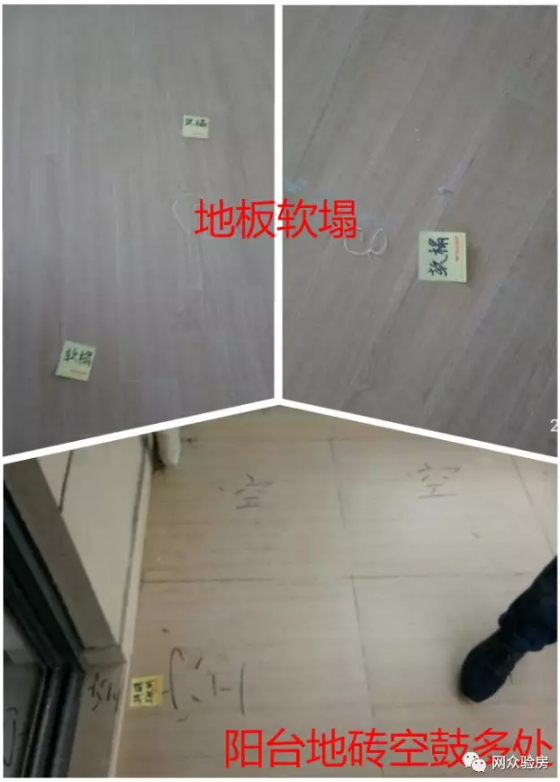 1、精装房卧室地板软塌;阳台地砖空鼓多处
