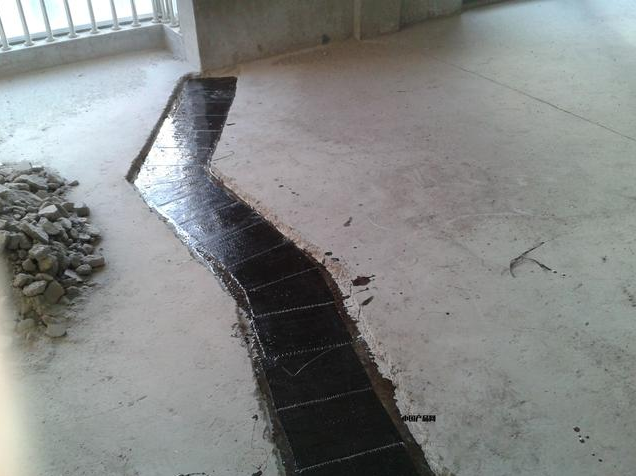 当我们不幸遇到贯穿性裂缝时一般工程上是怎么整改的呢?首先我们先将裂缝处切开、清理干净,然后顺着裂缝切"V"字形槽、注环氧树脂等胶结材料还可以再铺一层碳纤维网加固。做好以后应该是这样的