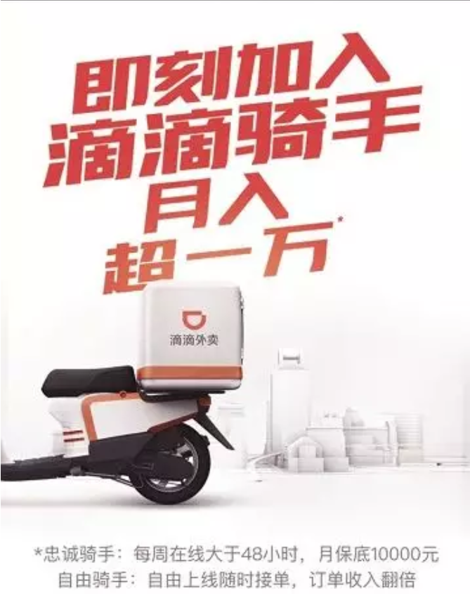 比如滴滴将外卖骑手划分为“忠诚骑手”和“自由骑手”两类。其中,据消息指出,“忠诚骑手”月保底10000元,但要求每周在线时间大于48小时,而“自由骑手”可以随时接单,订单收入翻倍。如果仔细去想的话,它拥有的优势在于它的品牌声量与它的用户规模。