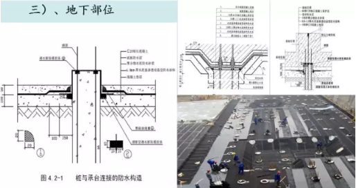 地下室关键部位防水构造列举:桩基础,钢筋伸进底板,桩头做环型防水卷材