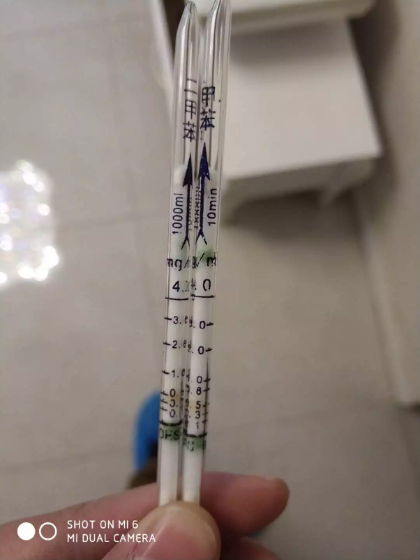 e、剪一支甲醛试剂将管中溶液分别加入样品及空气比色瓶中,摇匀10s充分混匀。