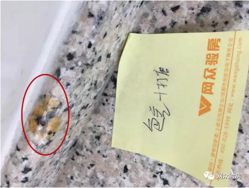 厨房存在的问题相对较多:墙、地砖局部空鼓、不平;厨房门内侧右边周边需打胶勾缝;大理石面板一处色差;橱柜局部损伤等