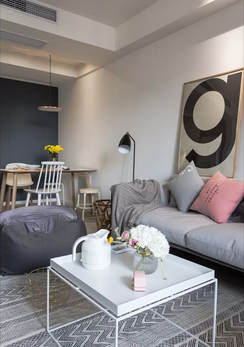 地毯来自mini more,懒人软墩购自无印良品,白色方型茶几来自HAY,桌上的小粉红非常Q,原来是一只小音箱!