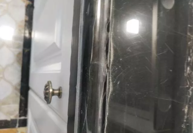 玻璃局部刮花、密封条短缺、入户门锁扣板中间分割横条竟然用切割机切了一块,有点搞不懂这是什么意图。