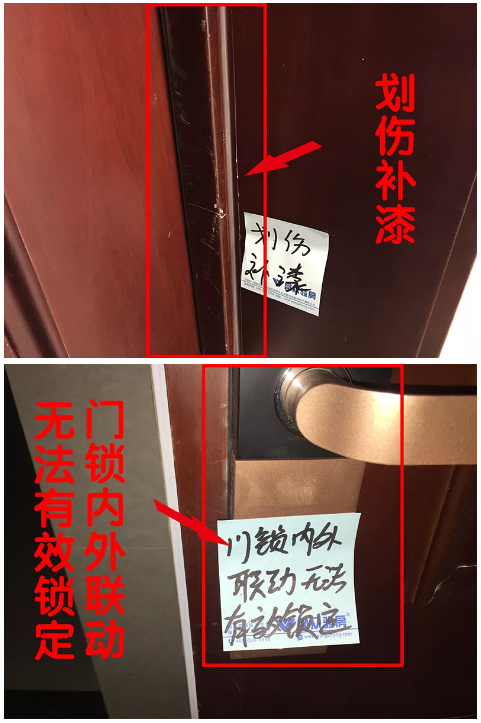 门面:门扇内外有无磕碰、划痕、补漆色差、猫眼缺失及生锈、损坏